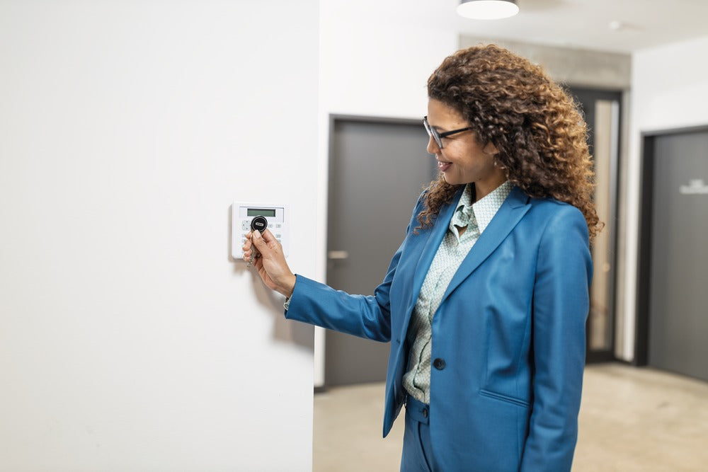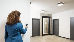 - Control unit with keypad and RFID reader / proximity reader (Mifare-Desfire) for indoor use